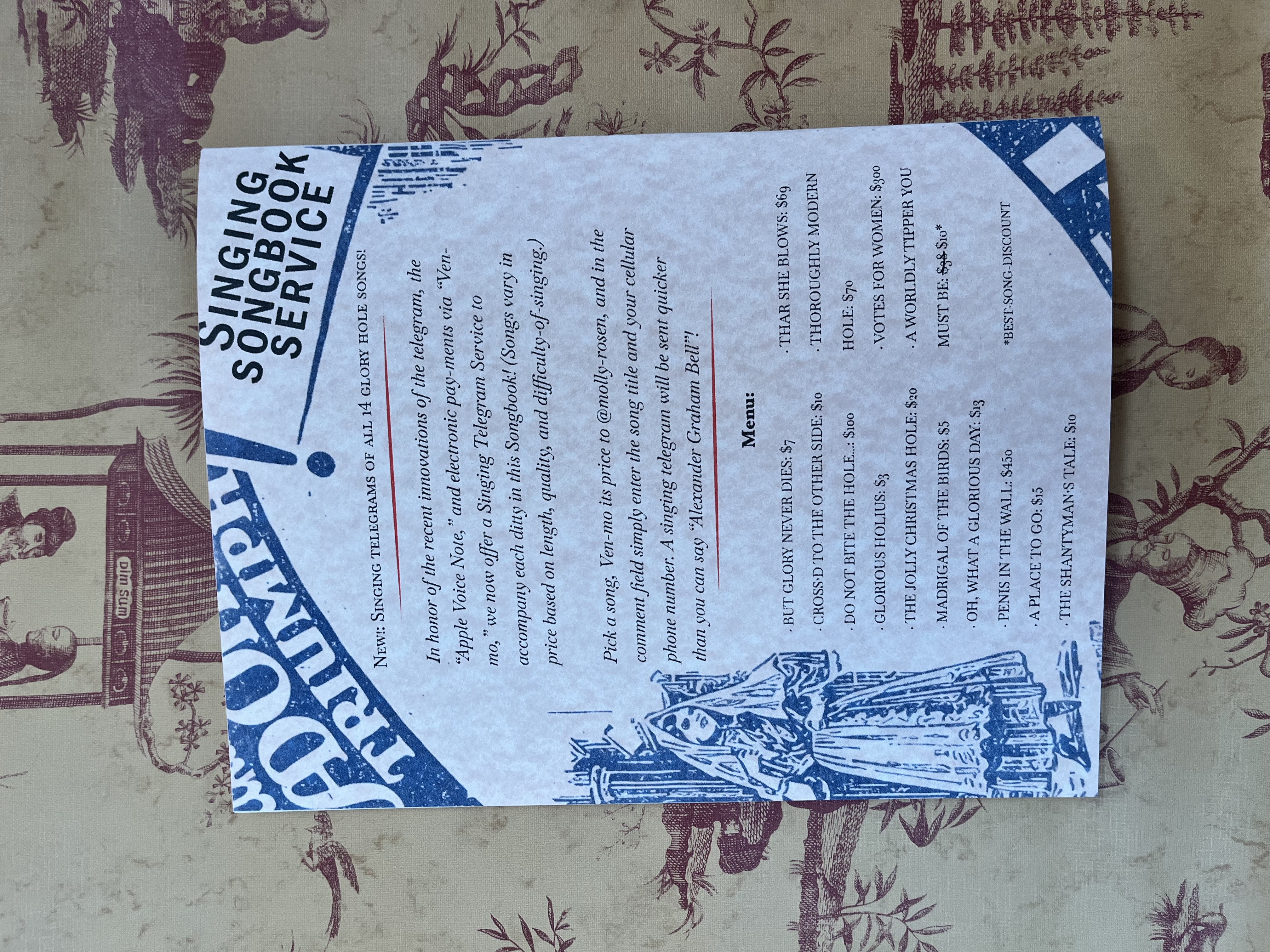 A “found object” with over a dozen public domain songs about glory holes, spanning genre (madrigal, hymnal, patter song), language (Jazz age slang, Latin, Quebecois), and topic (covering glory hole etiquette, tending, patriotism, and more). You’ve never seen a book of sheet music like The Great American Glory Hole Songbook. Comes with a limited edition, hand-drawn trompe de l'oeil cutout cover.Era: 1880s - 1925